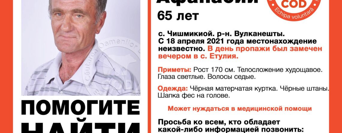 Сотрудники сектора полиции и примэрия села Етулия информируют о том, что в понедельник, 2 августа снова будут осуществляться поисковые мероприятия по поиску, без вести пропавшего жителя села Чишмикиой, Урум Афанасия Лазаревича. Для участия в поисковых мероприятиях приглашаются добровольцы. Для более тщательного поиска необходимо больше людей. Поэтому приглашаются добровольцы. Чем больше людей будет привлечено, тем эффективнее поисковые работы. Сбор участников поисковых мероприятий состоится...